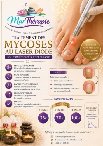 MarTherapie à Echternach propose le traitement des mycoses des ongles au laser diode, une solution efficace, sûre et durable. Ce traitement cible le champignon en profondeur, sans douleur et sans éviction sociale.
