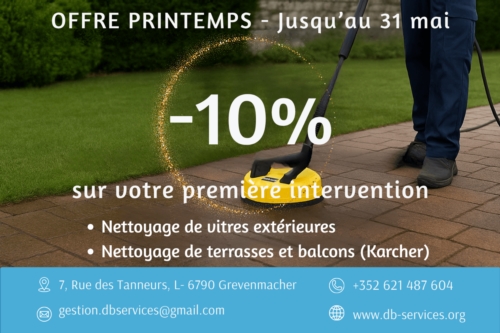 Nous assurons également des services de nettoyage professionnels : nettoyage domestique, nettoyage de bureaux, nettoyage de vitres, terrasses, pavés, surfaces extérieures et nettoyage haute pression (Karcher).