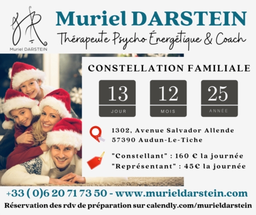 La journée « Constellation Familiale » du Samedi 13 Décembre 2025 aura lieu de 9h00 à 19h30 au cabinet : 1302, Avenue Salvador Allende, 57390 Audun-Le-Tiche (Lorraine, Proche Belval, Luxembourg)