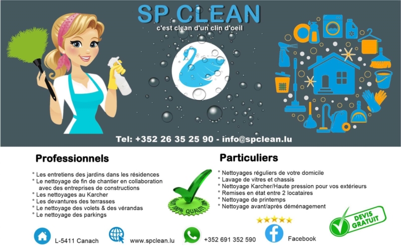 SP CLEAN est une société de nettoyage basée à Bertrange, fondée par M. Azevedo et Mme Pereira début 2021, bénéficiant déjà d’une expérience solide dans le domaine.