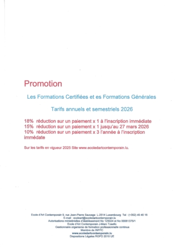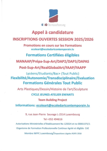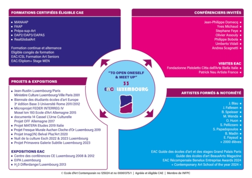 D’Programmer vun der École fir Zäitlech Konscht (EAC), dorënner Prépa-Sup-Art an Post-Sup-Art, sinn entwéckelt fir Lycéesschüler, Studenten a Proffen am Beräich vun der kënschtlerescher Erzéiung, déi sech ëmorientéieren oder sech op Exame virbereeden.