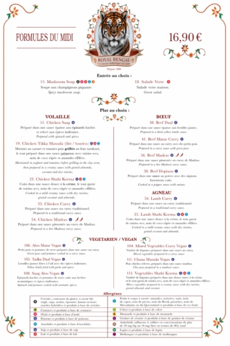 Entdeckt Spezialitéiten ewéi Tandoori, Chicken Tikka Masala oder Malai Curry, souwéi vill vegetaresch Optiounen. Et gëtt och e Menu du jour, ideal fir d’Mëttespaus.